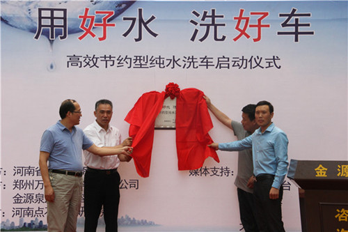 启动仪式上,与会嘉宾为高效节约型纯水洗车示范店进行揭牌。郑州万绿环保科技有限公司总经理饶有义讲述了作为一名普通公民,一个热爱环保的志愿者,如何苦心钻研节水技术,一心想为节能环保事业做些贡献的决心,赢得现阵阵掌声。